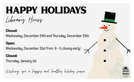 The library will be closed for the Christmas holiday - Wednesday, December 24 through Thursday, December 25. We will re-open on Friday, December 26.