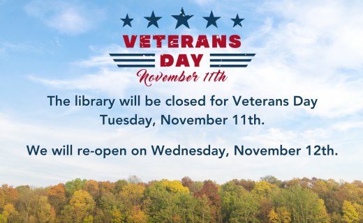The library will be closed for the holiday - Tuesday, November 11. We will re-open on Wednesday, November 12.