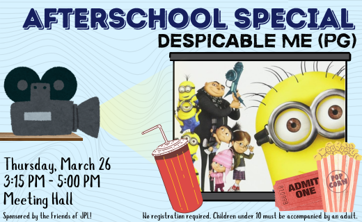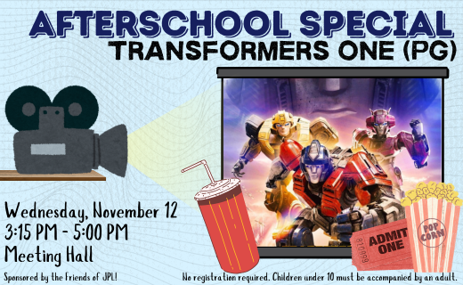 Join us in the meeting hall for a movie and unwind after a busy school day! Snacks and drinks are welcome. All movies start at 3:15 pm. No registration required.