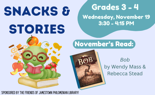 Join Colleen & Erin for Snacks & Stories: Book Club for Grades 3 & 4. We meet after-school, once-a-month, to chat about books over snacks.